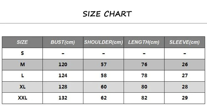 | SIZE | BUST(cm) | SHOULDER(cm) | LENGTH(cm) | SLEEVE(cm) |