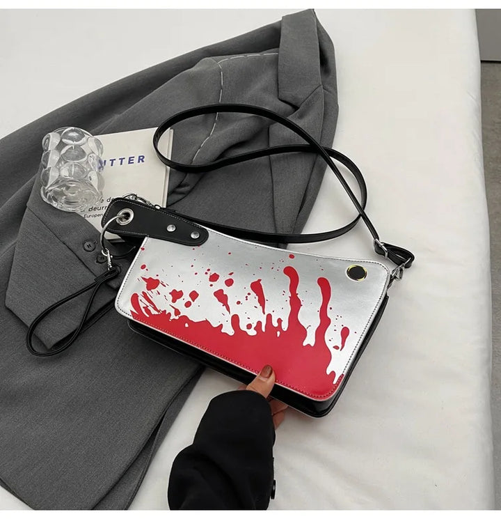 Y2K scream queen essentials! Glossy 'knife' clutch with dripping resin 'blood' accents. Perfect for Halloween or cutting through fashion norms.
