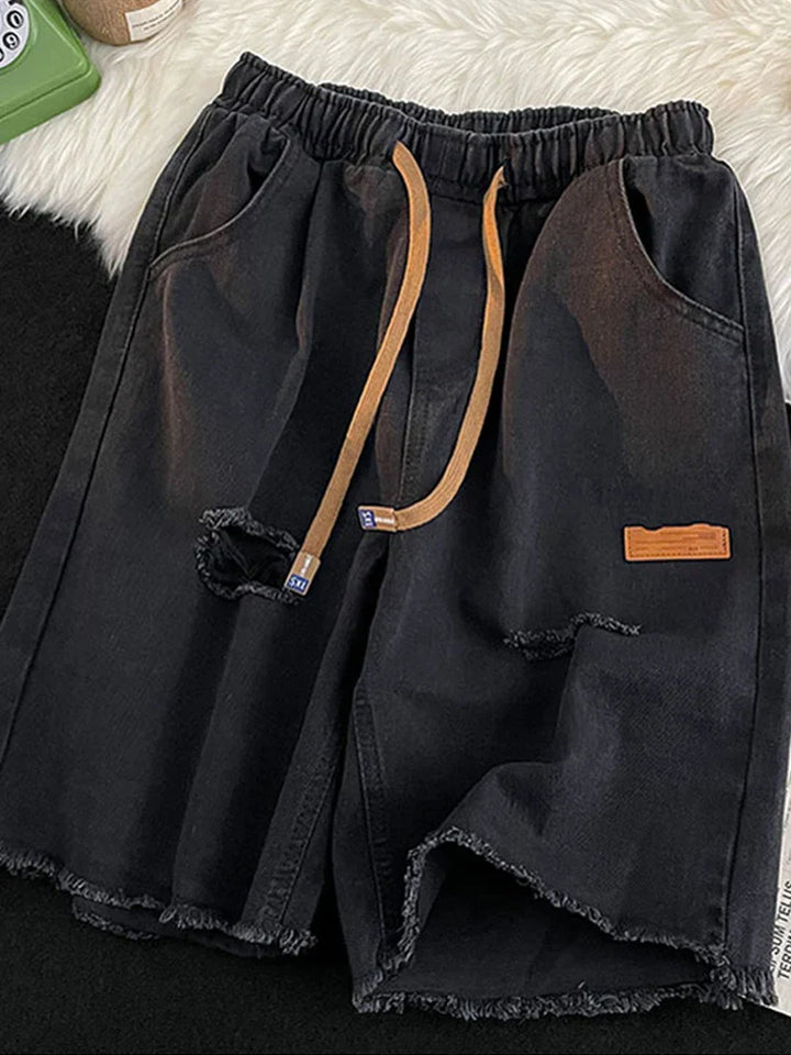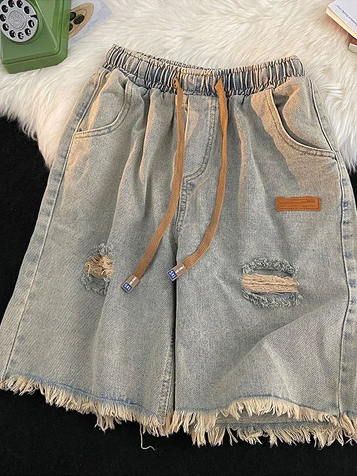 Blue Vintage Ripped Denim Drawstring Shorts