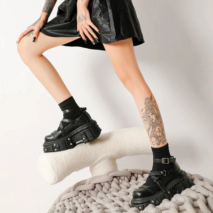 Cross Belt Black Leather Shoes – Gothic harness detailing meets sleek sophistication! Polished vamp, adjustable straps & armor-like shine. For dark romantics and modern rebels.