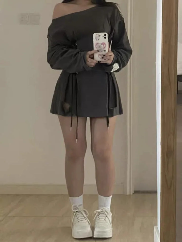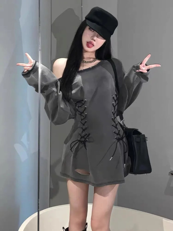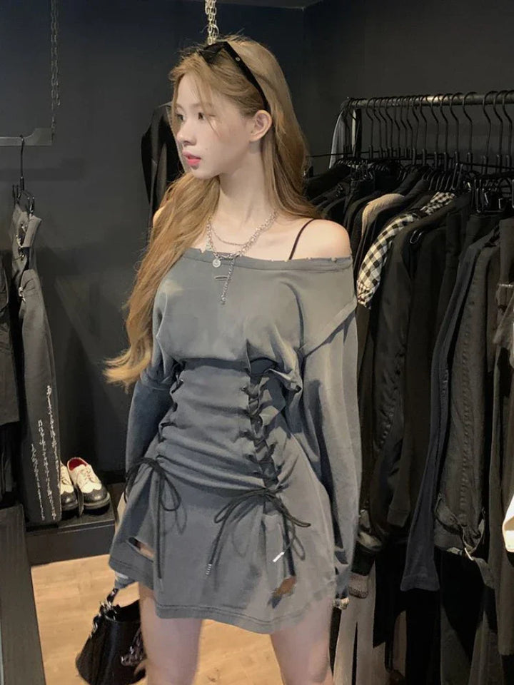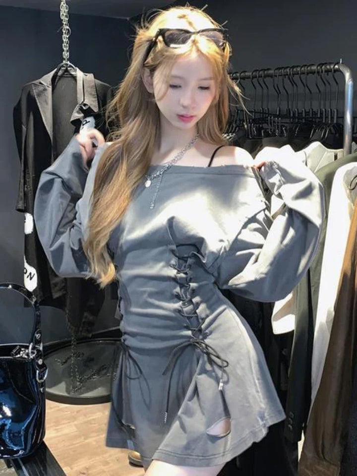 Slash Neck Acubi Smoke Lace Up Mini Dress