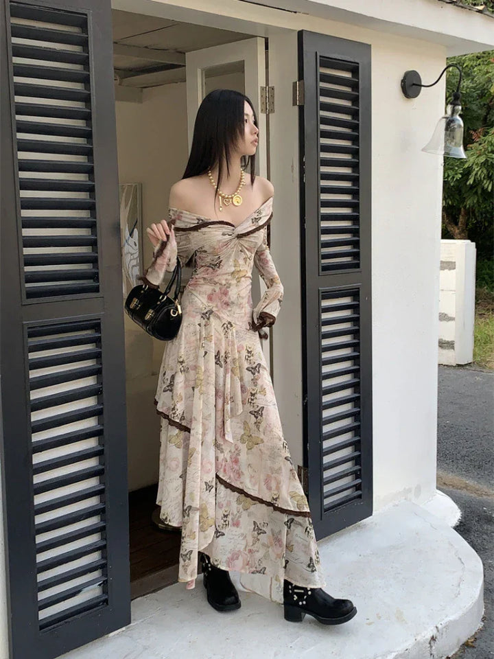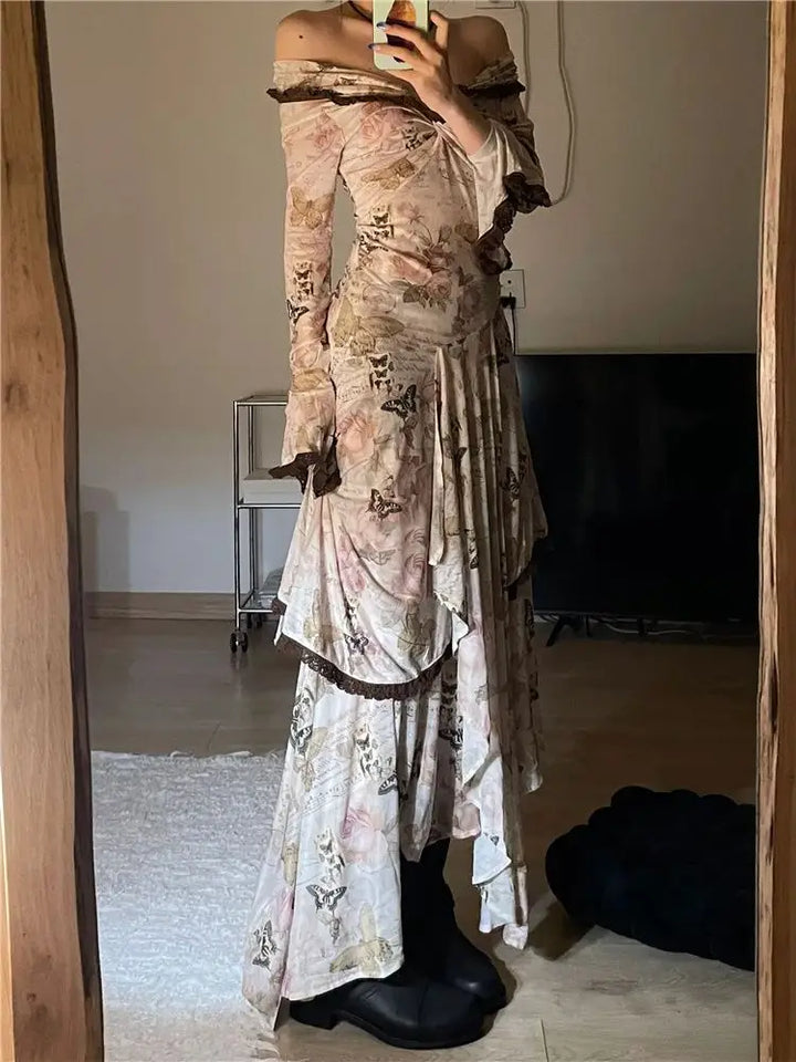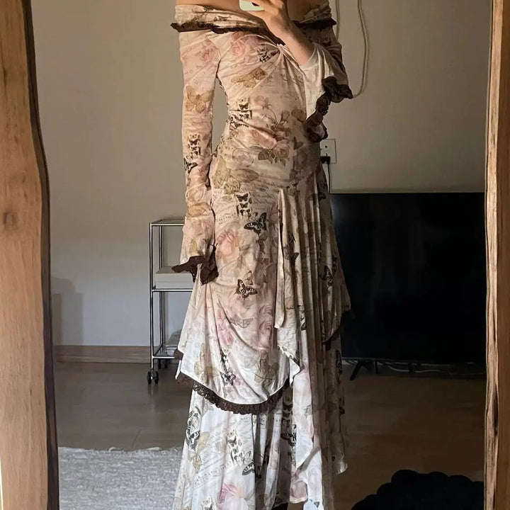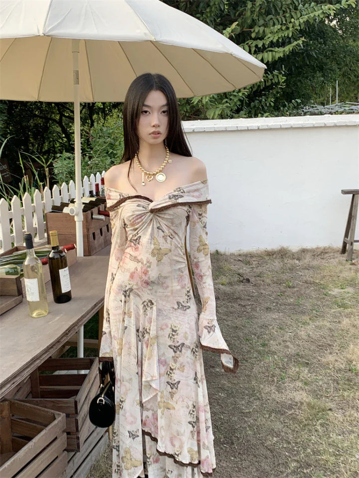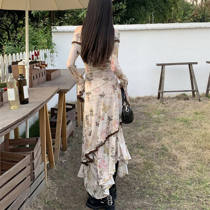 Butterfly Printed Slim Fit Vintage Midi Dress