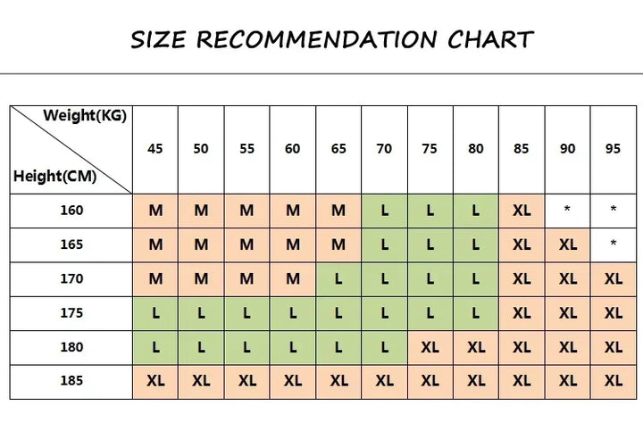 | 165 | M | M | L | L | L | XL | XL | XL | * | * | |