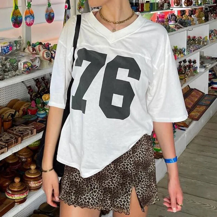 Y2K Sporty Number Printed V-Neck T-Shirt