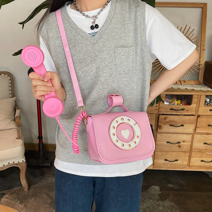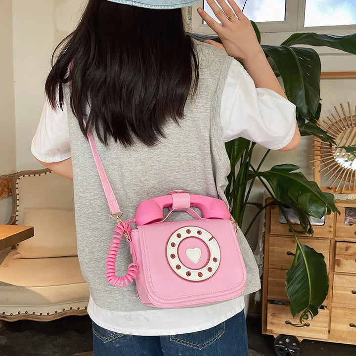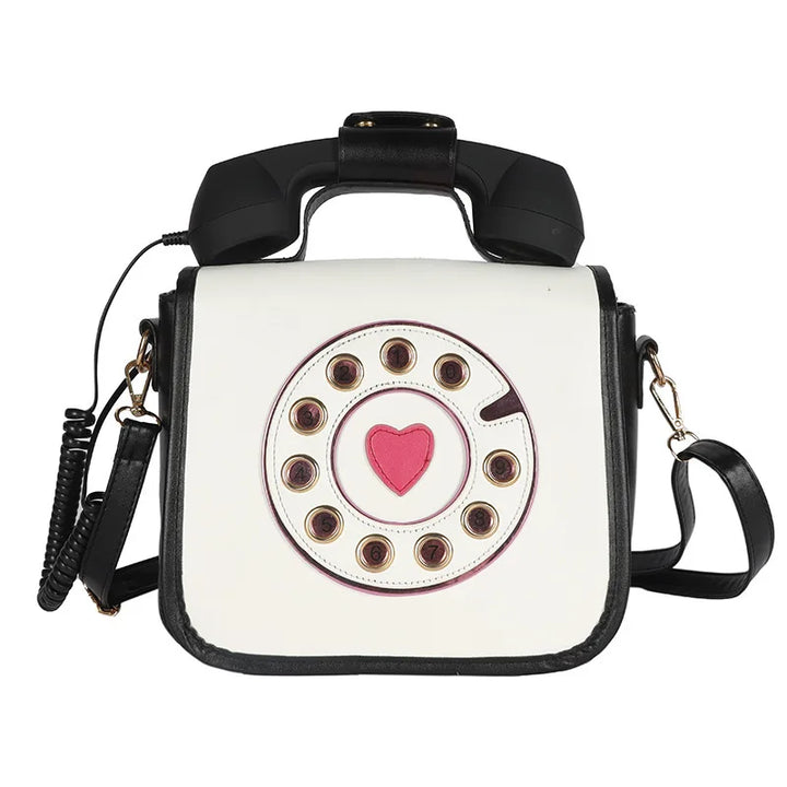 Y2K telephone purse that dials up the nostalgia! Functional spinning dial, coiled cord strap & secret selfie mirror. For call-waiting fashion emergencies.