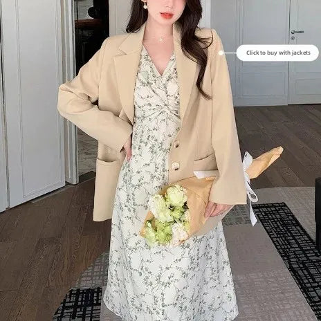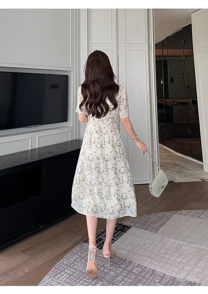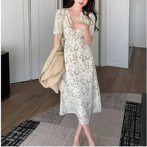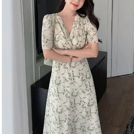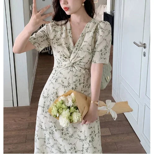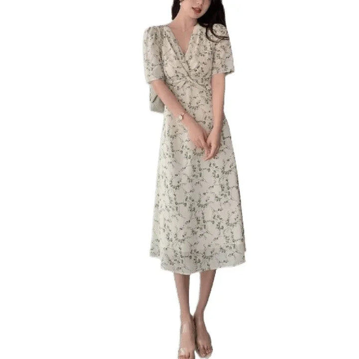 Green Floral V-neck Chiffon Midi Dress