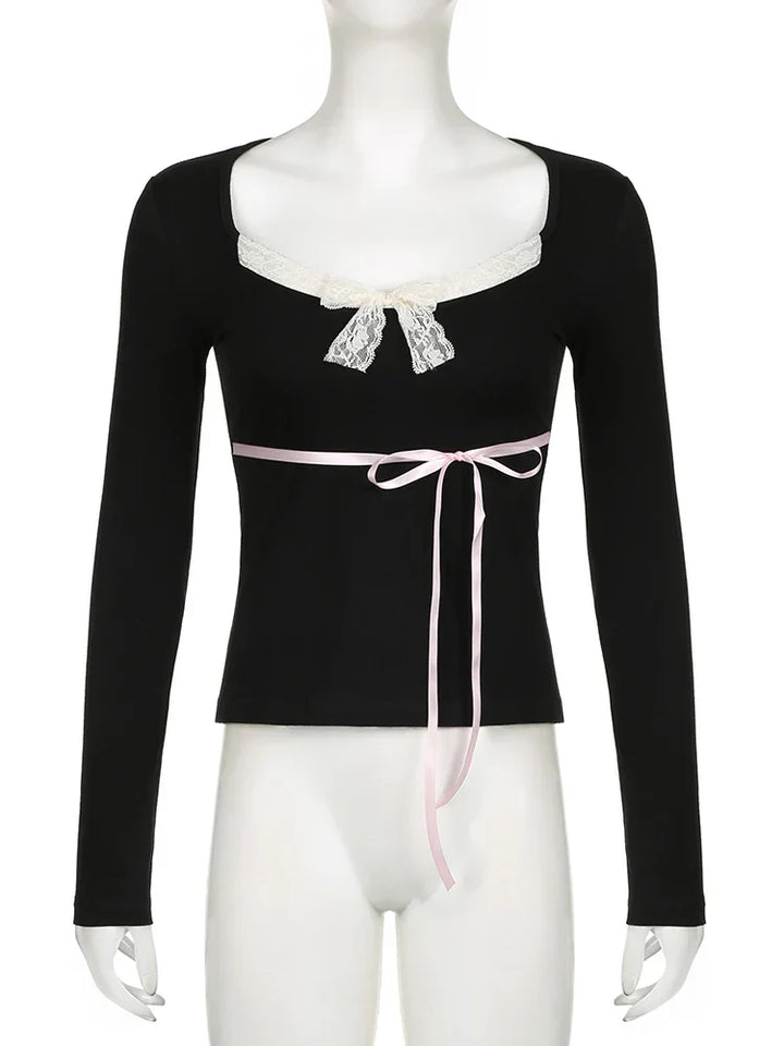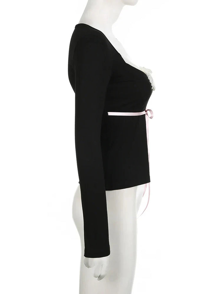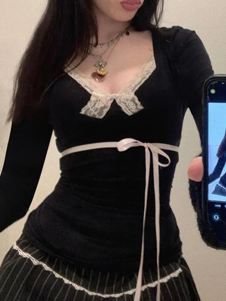 Sweet Lace Trim Deep V-Neck T-Shirt