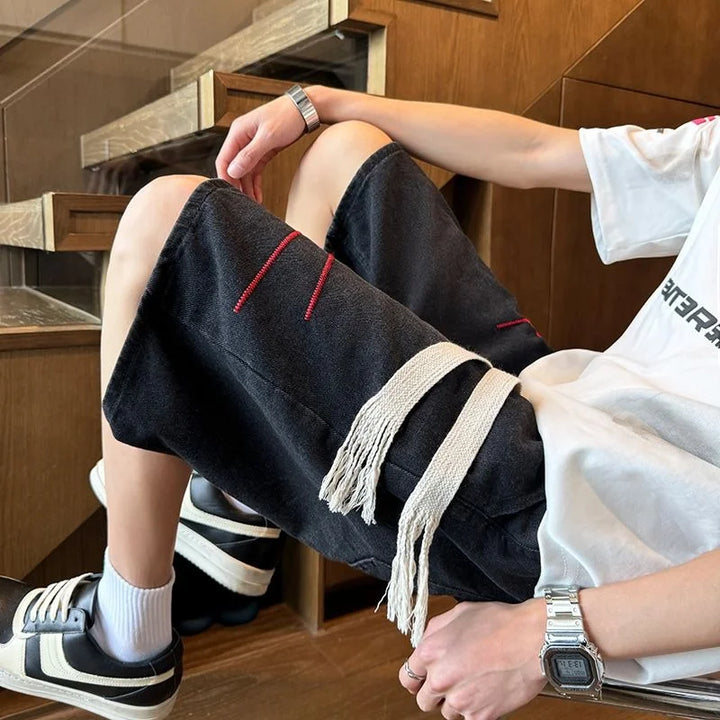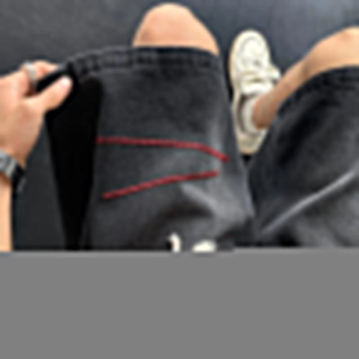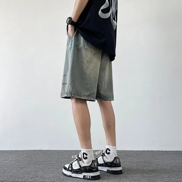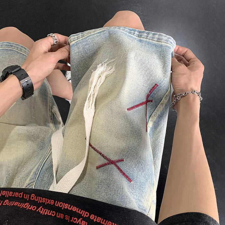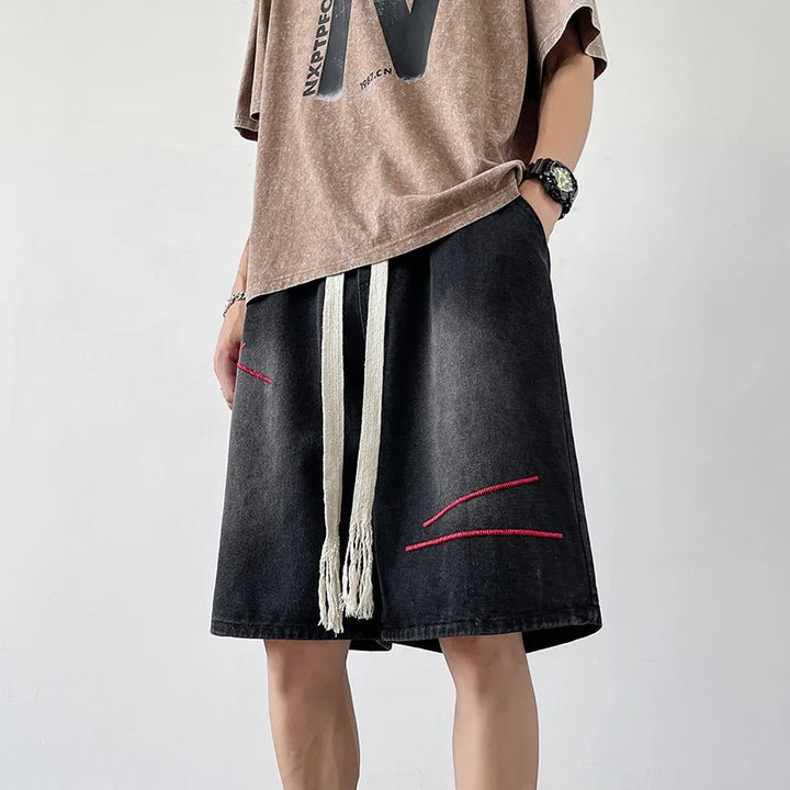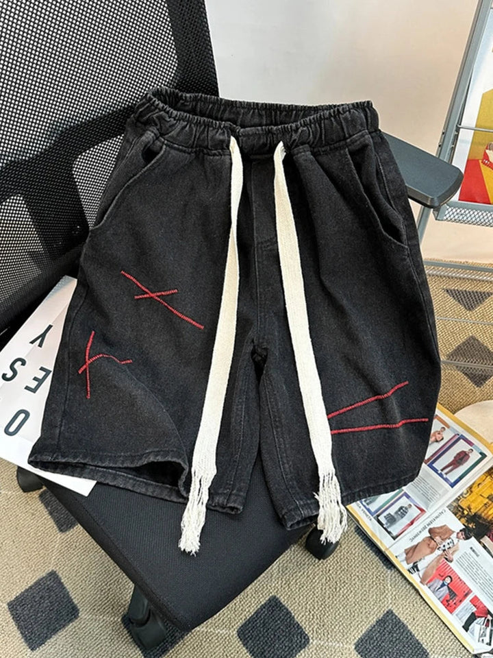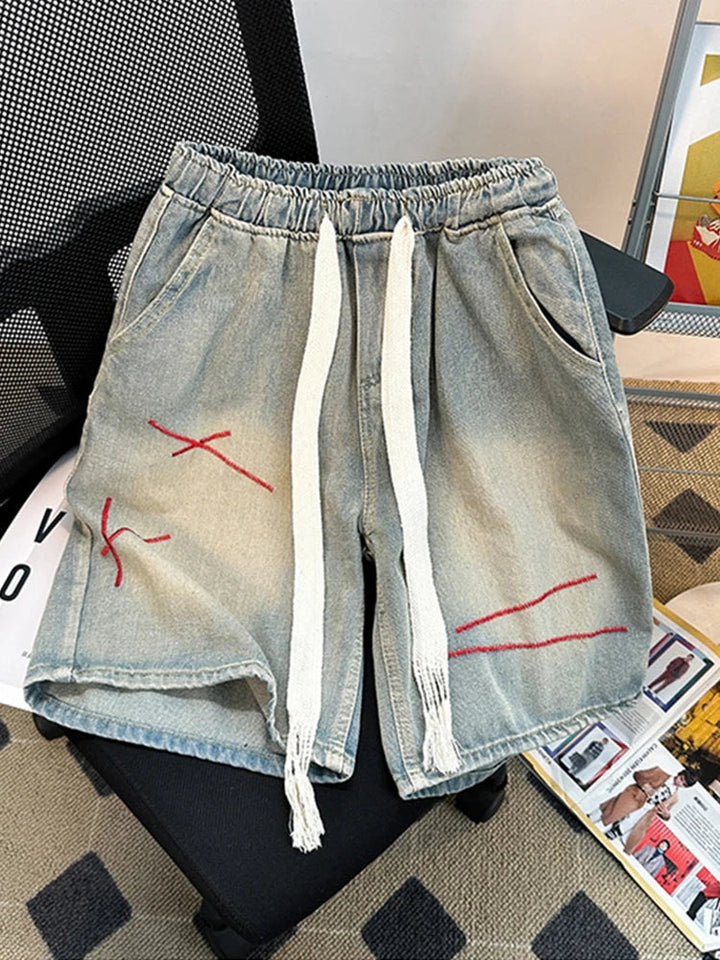 Vintage Washed Embroidered Drawstring Denim Shorts