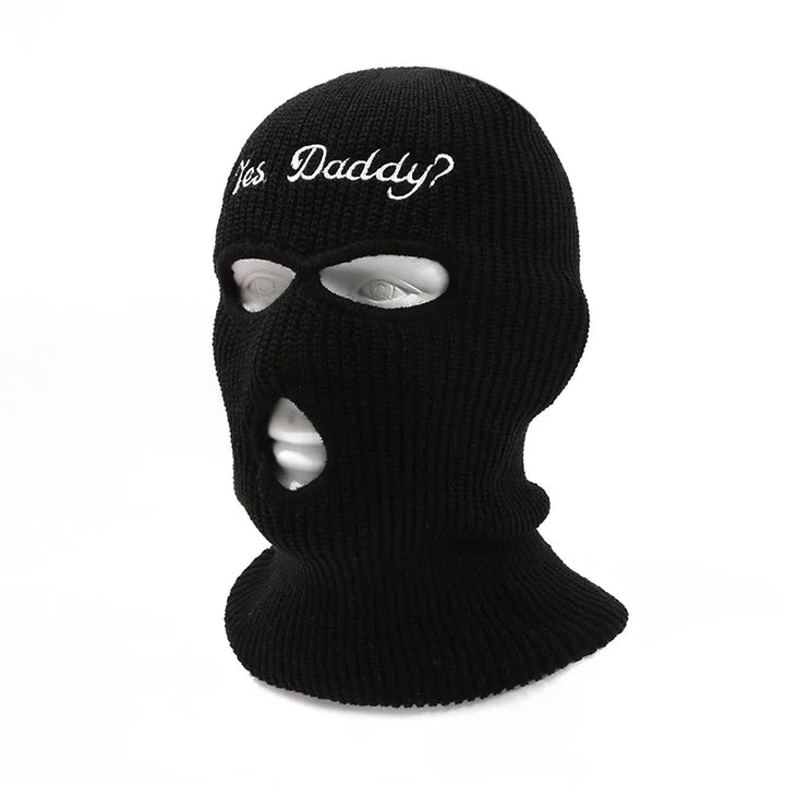 Dominant aesthetic full face mask featuring 'Yes Daddy' text. Matte black finish, secure fit & subversive clubwear energy. Own the room while hiding in plain sight